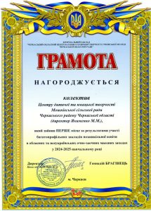 1.1. ЦЕНТР ДИТЯЧОЇ ТА ЮНАЦЬКОЇ ТВОРЧОСТІ МОШНІВСЬКОЇ СІЛЬСЬКОЇ РАДИ ЧЕРКАСЬКОГО РАЙОНУ ЧЕРКАСЬКОЇ ОБЛАСТІ (далі – Центр) є комплексним закладом позашкільної освіти, що організовує роботу з вихованцями, учнями і слухачами (далі − здобувачі освіти) за різними напрямами позашкільної освіти.
